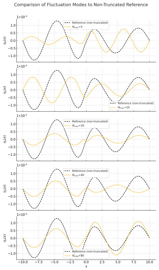 We solve this equation numerically for different values of to illustrate clearly how finite truncation affects the soliton solutions. Figure 1 shows the fluctuation modes for selected truncation values.