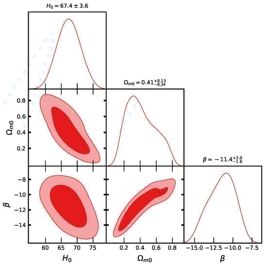 The Hubble function (37) contains six parameters, and to estimate them independently, we remove the degeneracy between them. For this, we choose , , and , as suggested in [], and the Hubble function  is thus reduced in terms of three independent parameters: , and . Table 1 shows the estimated values of these parameters using the CC and CC+Pantheon datasets with MCMC analysis and their contour plots are shown in Figure 1 and Figure 2, respectively, along with two datasets at  and  confidence level.