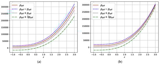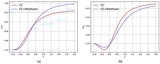The change in the effective equation of state parameter, , shows the matter phase. Its formula is found in Equation (43). The geometrical behavior of  over z is shown in Figure 3a. From Figure 3a, one can observe that  is an increasing function of z, and it tends to the CDM value when . We have calculated the current values of the effective equation of state parameters, which are  and , based on observational data. These values are in excellent agreement with recent observations. Figure 3b depicts the evolution of the dark energy EoS parameter  versus z. In Figure 3b, you can see that the value of  crosses -1 (which is the value for the CDM model) and approaches this value again in the far future. We estimated the current value of the dark energy EoS parameter as  along the CC data and  along the CC+Pantheon data. These values of  indicate the phantom dark energy behavior of the derived model.