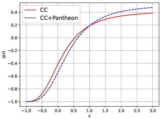 The expansion phase of the universe can be explained with the evolution of the deceleration parameter , and its expression is given in (39). Figure 4 shows how  changes with z. It demonstrates that  increases as z increases, but there is a point where its trend changes direction. This point is known as the transition (decelerating to accelerating) point, and the value of z for which  is called the transition redshift, denoted by . We can obtain a decelerating universe phase for  and an accelerating universe phase for  while  represents the transition line. We have obtained the transition redshift value as , along the CC and CC+Pantheon datasets. The current value of the deceleration parameter is  according to the CC data, and  based on the joint data from CC and Pantheon. Both values are negative, showing that the universe is currently in an accelerating phase. In Figure 4, one can find  as  and , for . For the current accelerating universe, the value of  should be greater than . Thus, the estimated value of  reveals the transit phase accelerating characteristics of our derived universe model. The transition redshift value  was recently estimated in [] as  along the SNIa dataset, and along the Hubble dataset, they found  in  theory. In an  gravity framework, it is found as  []. This transition value is estimated as  in [],  in [], and  in [,]. Thus, our estimation of the value of  is acceptable.
