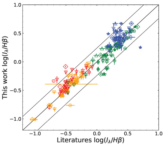 Comparison between the emission-line fluxes for the same H ii regions measured in this work and those quoted from other studies, including McCall et al. [33], Fierro et al. [34], Garnett et al. [35], Bresolin et al. [36], Garnett et al. [37], Mao et al. [18], and Rogers et al. [40]. The emission lines include [O ii] 3727 (blue), [O iii] 4959,5007 (green), [N ii] 6584 (yellow), and [S ii] 6717,6731 (red), and they are normalized by H. The data points are marked using the same symbols as in Figure 1. The line of unity is represented as the black solid line. The ( dex, i.e., the standard deviation of the data) range are enveloped by the black dotted lines.