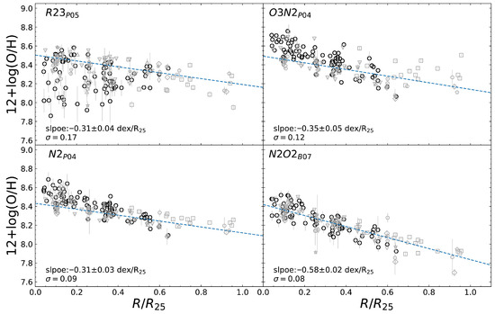 Nonetheless, the data points from the outer part of the galaxy () lie in the conjunction zone of the higher and lower branches of the calibration and thus appear with dispersion in the -based estimates of metallicity. For the H ii regions located in the inner area of the galaxy (), even larger dispersion emerges in the -based estimates of metallicity (see the top-left panel of Figure 4). This is likely due to an inherent problem in the Pilyugin and Thuan [7] calibration. We found these data points in possession of lower excitation levels (quantified by the excitation parameter P as defined in Equation (3)). As pointed out in Moustakas et al. [56], the R23 calibration lacks sufficient low-excitation () data, which prevents its good performance in such a regime and thereby induces the dispersion in estimates of metallicity.5