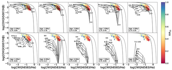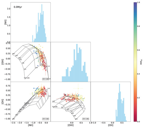 Combining Figure 3, Figure 5, Figure 6, Figure A1, Figure A2, Figure A3, Figure A4, Figure A5, Figure A6, Figure A7, Figure A8 and Figure A9, we find that a few of the data points from the central area of the galaxy are missed by the 0 Myr model but covered by the 2–6 Myr grids, which indicates an older stage for these H ii regions than others in the sample. It is interesting that at the 3–6 Myr evolution phase, the model grids emerge with peculiar fluctuation at the high-metallicity part, which is ascribed to an influence of Wolf–Rayet (W-R) stars on the [O iii] emission lines (Levesque et al. [12]).