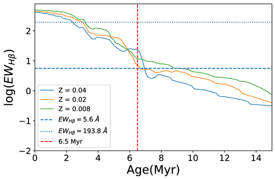 Constraints on the stellar population age derived from the equivalent width of the emission line (). The model curves show –age relations for instantaneous bursts at different metallicities from the STARBURST99 model (Leitherer et al. [41]) using the publicly available 1999 dataset downloaded from the official website. Horizontal dotted and dashed lines mark the observed maximum and minimum values of the emission lines across the galaxy. The red vertical line indicates the 6.5 Myr upper-age limit inferred from the BPT diagram coverage. The minimum value is found in the central, higher-metallicity region, consistent with an age of ∼7 Myr (Z = 0.02).