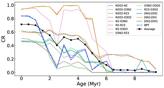 The CR (the same definition as in Figure 5) of the model grid as a function of the age ranging from 0 to 9.5 Myr, for the diagrams in Figure 3, Figure 5 and Figure 10. The dashed lines are color-coded by specific index–index relations with the legend displayed in the top-right corner. The black filled boxes connected by the black solid line represent the average evolution of the CR among all of the diagrams.