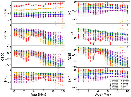 Spectral index or H-normalized emission lines of [O iii], [N ii], and [O ii] (hereafter referred to as [O iii], [N ii], and [O ii], respectively) as a function of age reproduced by the Levesque et al. [12] model. In each of the panels, the model products are color-coded by metallicity and symbol-coded by the ionization parameter, with the legend listed in the lower-left corner in the bottom-right panel.