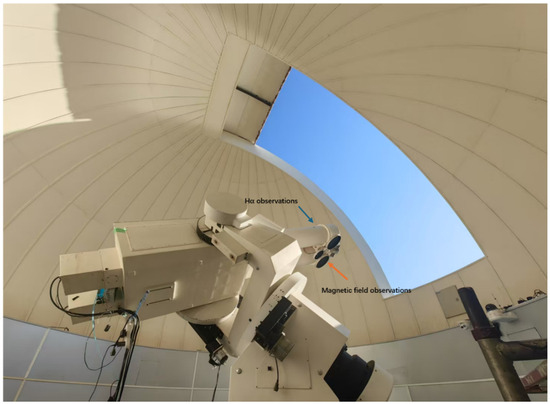 Solar flares are caused by the sudden release of magnetic energy in the solar atmosphere [11,12]. In rare cases, apart from the enhanced spectral lines formed in the chromosphere and above, solar flares may also exhibit enhanced emission in the visible light continuous spectrum. These flares are referred to as white light flares (WLFs) [13,14]. Since the first observations of WLFs by Carrington (1859) [15] and Hodgson (1859) [16], the number of such events recorded in the literature has been very small compared to the total number of solar flares [17,18]. Moreover, solar activities do not cause significant changes in the solar constant value [19]. Therefore, it can be considered that under normal circumstances, there will be no obvious change in the brightness of the solar photosphere during a flare. Considering that the Solar Magnetic and Activity Telescope (SMAT) has adjacent chromospheric and photospheric telescopes as shown in Figure 1, where the blue arrow points to the chromospheric telescope and the orange arrow points to the photospheric telescope, we propose the hypothesis that the modulation effect of thin clouds on the brightness of the dual-band observation images of the SMAT is consistent.