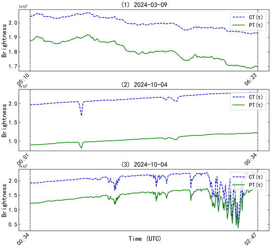 Brightness curves of SMAT observations under three different cloud conditions: (1) thin cloud, (2) intermittent structured cloud, and (3) thick cloud. Black dashed vertical lines denote the time interval covered by the observational data.