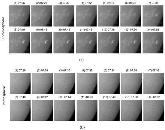 The flare occurrence regions in the chromospheric and photospheric images obtained through simultaneous observations using SMAT from 07:26 to 07:52 (UTC) on 3 July 2024. (a) The measured chromospheric image and (b) the measured photospheric image.