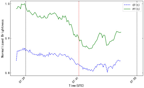 The Brightness curves of the SMAT observational data for the M1.5 class solar flare on 3 July 2024. The blue dashed line and green solid line represent the chromospheric (CT(t)) and photospheric (PT(t)) brightness curves, respectively. The black vertical dashed lines indicate the start and end times of the flare, while the red vertical dashed line marks the time of the X-ray flux peak.