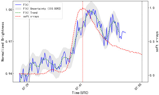 The brightness curve reconstructed from the SMAT observational data. The blue solid line represents the reconstructed curve F(t), and the green dashed line is the trend line of F(t). The light-grey shaded area indicates the error range of F(t). The red dashed line shows the normalized soft X-ray flux curve. The black vertical dashed lines mark the start and end times of the flare, while the red vertical dashed line corresponds to the peak time of the X-ray flux.