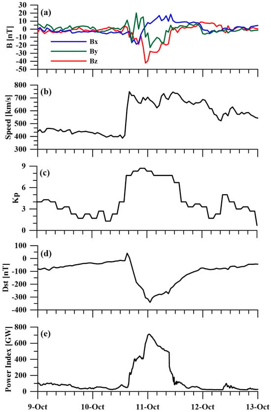 Behavior of (a) Bx, By and the Bz component of IMF; (b) solar wind speed; (c) Kp index; (d) Dst index and (e) Power Index for the period 9–12 October 2024.
