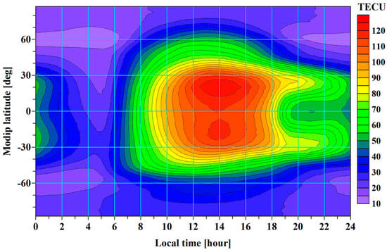 TEC data used in the present investigation are converted to a coordinate system with modip latitude and geographical longitude. The use of this modification was introduced by Rawer with the purpose of improving the accuracy of the representation of the ionospheric response at low and mid latitudes [].