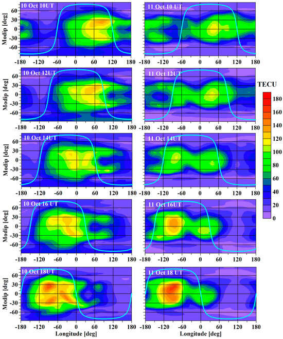 Figure 3 shows the global distribution of TEC at specific hours (between 10 UT–18 UT) for the days 10 and 11 October of the studied geomagnetic storm. The maps referring to 10 UT and 12 UT on 10 October illustrate the quiet conditions of the ionosphere and coincide with the medians presented in Figure 2. At 18 UT on 10 October, an increase in the TEC at lengths of 90 °W (12 LT) and a deepening of the splitting were observed, which could be interpreted as a consequence of the strengthening of the “fountain effect”. At longitudes 60 °E (22 LT), a decrease in TEC is observed. On October 11 at 10 UT, the longitudinal (and local time) distribution of TEC differs significantly from that under quiet conditions. At longitudes around 120 °W (02 LT, night conditions), both an increase in TEC and an expansion of the split region are observed, which can be interpreted as an increase in vertical drift and the “fountain effect”. The opposite is observed in daytime conditions (60 °E, 14 UT) with a decrease in TEC and disappearance of the splitting around the magnetic equator. The difference between 10 and 11 October is particularly strong at 12 UT.