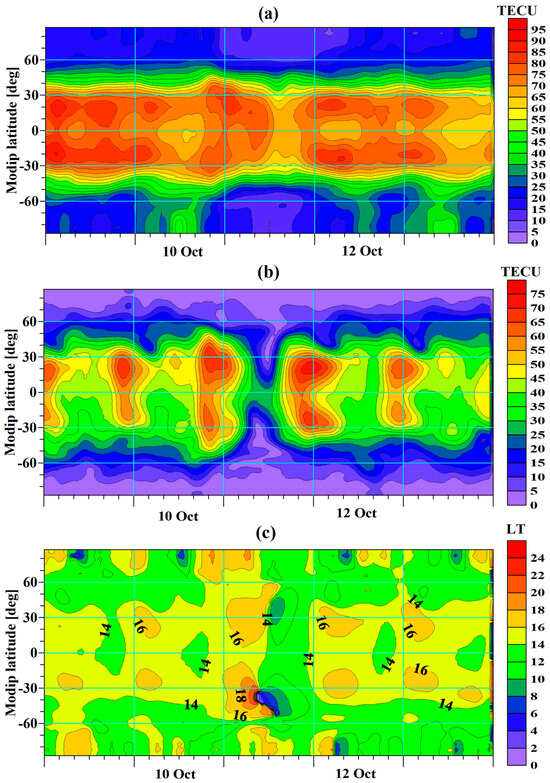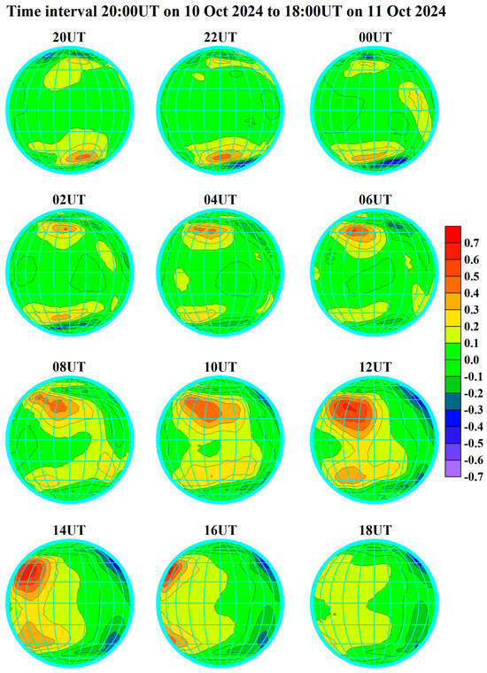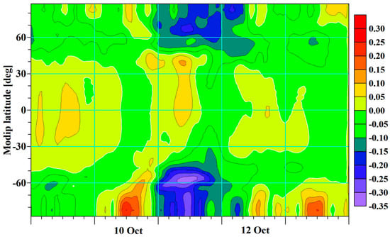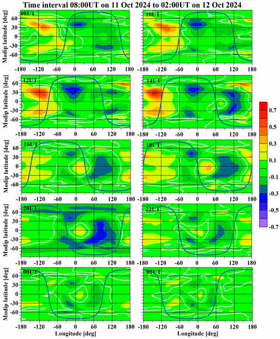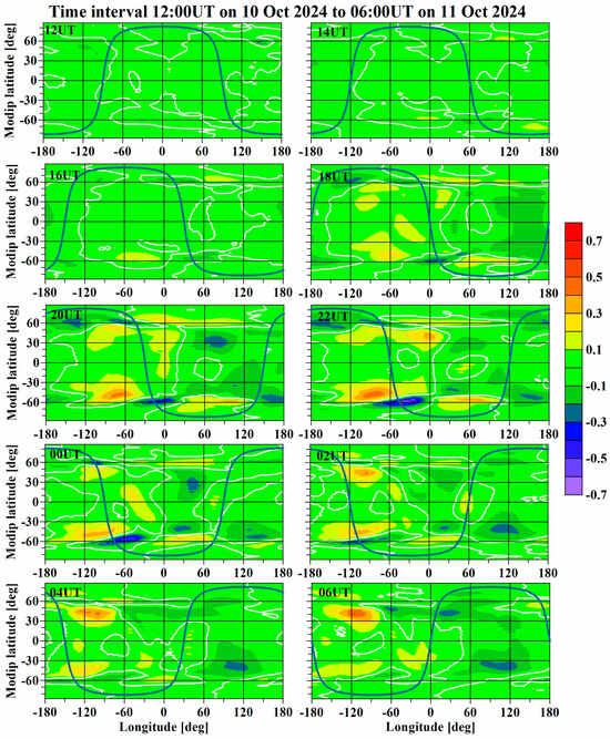 A similar representation of the spatial distribution of the ionospheric response is shown in Figure 7. In this particular example, the period 11 October at 08:00 UT–12 October at 02:00 UT is covered. The figure below shows that the positive anomaly of ±30° is formed in the night sector and is more significant in the northern hemisphere. TEC reaches maximum values around 12 UT–14 UT on 11 October. Along with the positive response, two pairs of areas are formed at the same modip latitudes, but one negative pair of responses occurs in daytime conditions, while the other occurs in night conditions. One of the pairs is located in the area of local noon, and the other pair is in the eastern hemisphere in the hours after sunset. The negative nature of the response can be interpreted as a consequence of negative drift caused by downward directed electric fields.