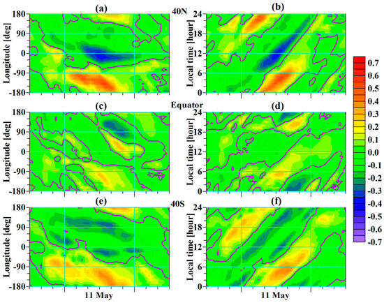 Additional visualization of the longitudinal and local time dependence of disturbed EIA during the considered geomagnetic storm is presented in the maps in Figure 8. This map shows the behavior of the relative TEC at modip latitudes 40 °N (a, b), equator (c, d) and 40 °S (e, f) depending on longitude and depending on local time from 12 UT on 10 October to 12 UT on 12 October. An area of positive response at both mid-latitudes appears at the beginning of the storm. A noticeable increase was observed during the night on 10 October and throughout the entire 11 October. The positive response is localized around 90 °W at the beginning of the day on 11 October and shifting to 180°W by the end of the day. An area with a negative response is observed at eastern longitudes with a corresponding slow westward shift. The longitudinal structure of the TEC response has a clearly pronounced “zonal wave with wave number 1” character. The slope of the zero value lines, especially on the right column of maps (dependence on local time) clearly shows that the movement of this “wave” from east to west has a phase velocity significantly smaller than the Earth’s rotation speed, which means that the time evolution of disturbed EIA cannot be represented only as a function of local time.
