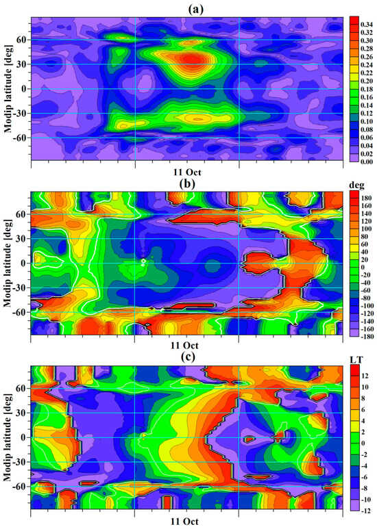 Figure 10a presents the amplitudes of the approximating cosine for all latitudes during the studied geomagnetic storm. Figure 10b demonstrates the behavior of the phases expressed in geographic degrees. Figure 10c illustrates the behavior of the phases expressed in local time. As can be seen from the figure, at the beginning of the storm, the amplitude of the two modip latitudes around 45 °N and 45 °S increases after 16 UT at a phase around 0° (local time around noon). After a certain attenuation, the amplitude increases significantly, especially in the northern hemisphere, and reaches a maximum around 14 UT on October 11 (at local time around 04 LT–06 LT). At this time, the energy entering the auroral regions from particle precipitation decreases to that under quiet conditions (see Figure 1d). By the end of the day on October 11, the amplitude decreases to low values, and the phase smoothly reaches about 180 °W.