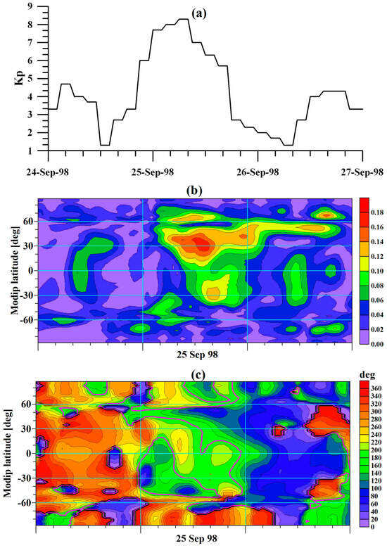 For comparison with the results of the storm considered above (October 2024), Figure 11 shows analogous representations for the geomagnetic disturbance during 24–25 September 1998. The results obtained for this storm can be compared with the main storm subject of this research for the following reasons: (a) it has practically the same intensity (Kp = 8.33—See Figure 11a); (b) it has the same duration (about one day); and (c) this disturbance also develops during equinox conditions. The behavior of the zonal amplitude presented in Figure 11b is very similar to that of the considered storm in October 2024. The maxima of modip latitudes ±30° are observed around 12 UT–14 UT on 25 September, shortly before the end of the storm. However, the phase progression presented in Figure 11c is different from the main event in October 2024. In the early hours of September 24, the phase is around zero (respectively 360°, eastern longitudes are presented on the map). The phase shifts westward to about 120° in the northern hemisphere and to about 140° in the southern hemisphere. The maxima have phases of about 180°, which means local time around midnight. Despite the noted differences, in this case too, a movement of disturbed EIA in a westerly direction is observed with a phase speed significantly smaller than the Earth’s rotation speed.