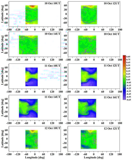 Spatial distribution of relative deviations of the ΣO/N2 compared to the undisturbed day 9 October for selected hours for the period 10 October 2024 at 10 UT–12 October 2024 at 12 UT.