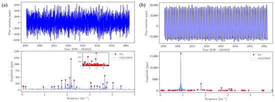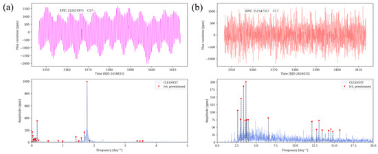 The temporal analysis of the corrected light curves was conducted using the cleanest algorithm [27], which is based on the Lomb–Scargle periodogram. This technique fits sinusoidal models using least squares and is well suited for detecting periodic signals in unevenly sampled data.