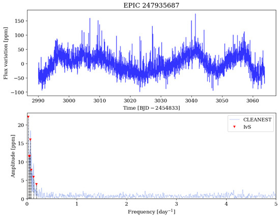 The star EPIC 247935687 (GSC 01834-00273), observed during Campaign 13, is a B9 star with a Gaia magnitude of 12.2. As shown in Figure 3, the light curve (top panel) does not reveal the coherent, multi-periodic oscillations that are characteristic of SPB stars. Instead, the corresponding power spectrum (bottom panel) displays a red-noise profile: The highest amplitudes are found at low frequencies, and the amplitudes of the significant peaks identified by the IVS prewhitening algorithm decrease steadily toward higher frequencies. This behavior is consistent with the definition of SLF variability, supporting the classification of this target as a stochastic pulsator.
