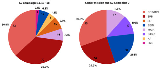 The full methodology and decision criteria used to assign each star to a specific variability class are described in detail in Section 4 of [12]. To ensure consistency with our previous work, we followed the same approach here. Our classifications were derived through a multi-step process that combined (i) visual inspection of K2 light curves, (ii) frequency analysis using iterative prewhitening, and (iii) cross-validation with the stars’ positions in the Gaia H–R diagram. Literature records from SIMBAD and VizieR were also consulted to complement the classification. Different team members independently reviewed the light curves, and any disagreements were resolved through discussion.