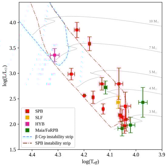 A class of hybrid pulsators, known as Cephei/SPB stars, has also been identified in the literature [61,62]. In addition to the characteristic high-frequency pulsations of Cephei stars, these hybrids also exhibit low-frequency pulsations typically found in slowly pulsating B-type (SPB) stars. In the H–R diagram, these hybrid stars are located at the intersection of the Cephei and SPB instability strips [63] and exhibit pulsation frequencies spanning the combined range of 0.5 to 20 d−1.