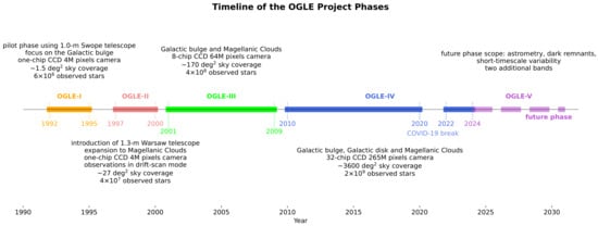 The OGLE project began in the early 1990s with a pilot phase (OGLE-I) using a 1.0-m Swope telescope at Las Campanas Observatory, Chile, primarily targeting the Galactic bulge [41]. The initial effort demonstrated the feasibility of long-term CCD monitoring of dense stellar fields by detecting the first gravitational microlensing events [54]. In the second phase (OGLE-II), a dedicated 1.3-m Warsaw telescope was constructed, significantly enhancing the survey’s capabilities and extending coverage to the Magellanic Clouds [55]. Later phases, OGLE-III and OGLE-IV, introduced significant instrumental improvements, particularly in the CCD mosaic cameras, enabling growth in both sky coverage and the number of observed stars [56,57,58]. Today, OGLE-IV used a 32-chip CCD camera and has monitored approximately two billion stars across more than 3600 deg2 of the sky, including the Galactic bulge, Galactic disk, Large and Small Magellanic Clouds, and Magellanic Bridge. The observations are conducted in two photometric bands: Johnson V and Kron-Cousins I. The basic characteristics of each phase of the OGLE project are summarized in Figure 1. Figure 2 presents the current OGLE-IV sky footprint.
