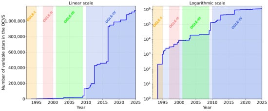 Number of variable stars published by the OGLE project in the years 1992–2025. Left and right panels show the number of variable stars in the linear and logarithmic scales, respectively.
