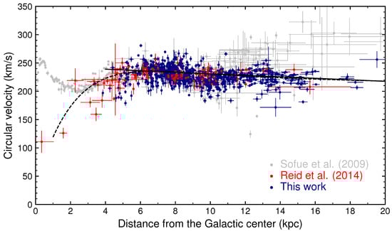 Rotation curve of the Milky Way obtained from classical Cepheids. The label “This work” is part of the original figure and refers to Mróz et al. [77], not to the present manuscript. For more information see [77,78,79]. © AAS. Reproduced with permission.