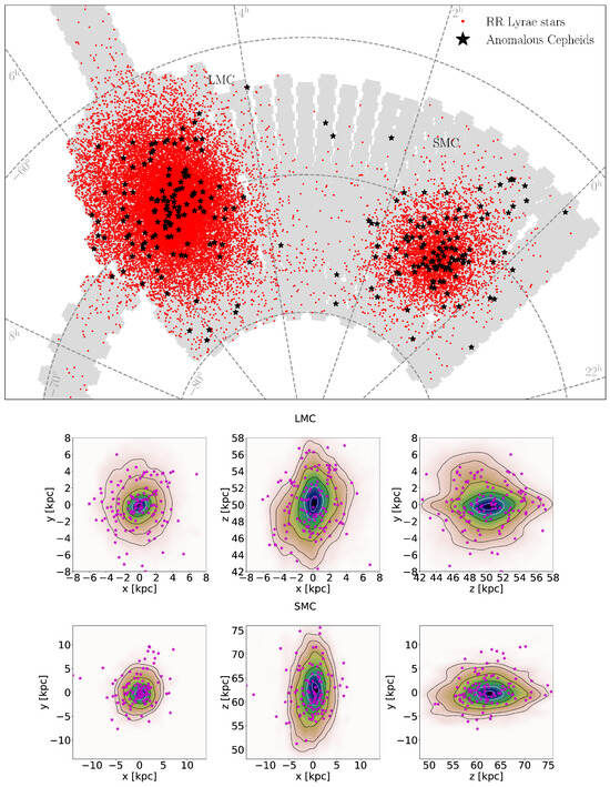 Spatial distribution of anomalous Cepheids in comparison to the distribution of RR Lyrae stars. Top panel presents equal-area Hammer projection of the MS, while middle and bottom panels present Cartesian projections for the Large and Small Magellanic Cloud, respectively. In the middle and bottom panels, RR Lyrae stars are shown as a color map with density contours, while anomalous Cepheids are shown as magenta points. For more information see Iwanek et al. [86].