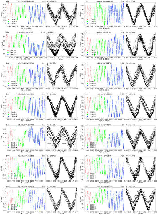 The OGLE projects has provided an unparalleled dataset for exploring the LSPs mystery. Over 16,000 well-defined LSP stars have been identified in the OGLE dataset, revealing common light curve characteristics and enabling in-depth statistical and phenomenological studies [99]. A gallery of examples of LSP light curves is presented in Figure 11.
