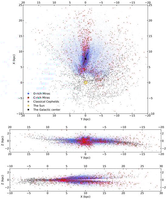 Based on Miras discovered in the Milky Way, Iwanek et al. [92] constructed a detailed three-dimensional map of our Galaxy. The authors analyze the spatial distribution of Mira variables using a model containing three barred components that include the X-shaped boxy component in the Galactic center, and an axisymmetric disk [93]. In the analysis, they took into account distance uncertainties by implementing the Bayesian hierarchical inference method. As a result, the distance to the Galactic center was measured (R0 = 7.66 ± 0.01(stat.) ± 0.39(sys.) kpc), as well as the inclination of the major axis of the bulge to the Sun-Galactic center line of sight (θ = 20. 2° ± 0. 6°(stat.) ± 0. 7°(sys.)), what is consistent with other studies, e.g., based on the RR Lyrae stars sample [94]. Finally, the authors showed independent evidence for the X-shaped bulge component. In Figure 9, the Milky Way map in three Cartesian projections composed of young (classical Cepheids) and intermediate-age (Mira-type stars) stellar populations is shown.