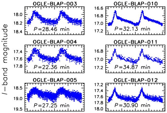 Phase-folded I-band light curves of selected BLAPs discovered in the OGLE data. Each light curve is phased with period P indicated in the plot. For more information see Pietrukowicz et al. [95]. Reproduced with Springer Nature permission.