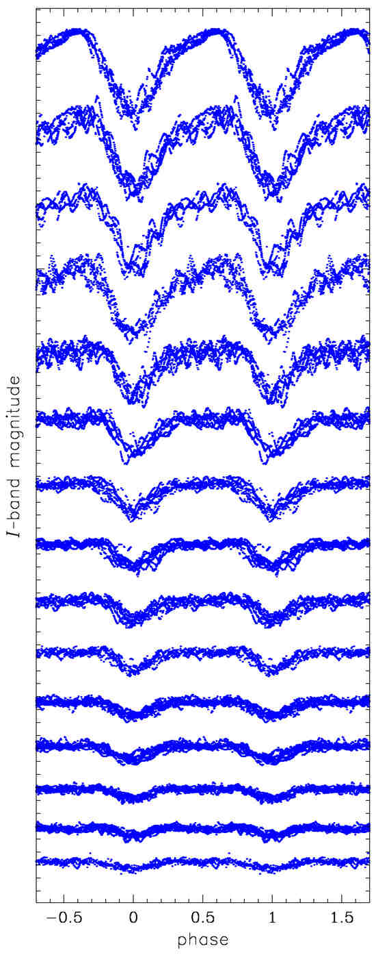 BLAPs constitute a recently discovered class of variable stars characterized by short pulsation periods—typically from several to several dozen minutes—and large optical amplitudes (≳0.2 mag in the I-band, [95]). Their phased light curves exhibit a distinctive sawtooth shape, which is shown in Figure 10. BLAPs are significantly bluer than main-sequence stars observed in the same fields, indicating that they are hot objects, with a spectroscopic follow-up confirming effective temperatures around 30,000 K.