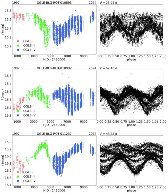 In the direction of the Galactic bulge, OGLE has identified and characterized over 18,000 rotating variable stars, including both dwarfs and giants [109]. These objects exhibit periodic or quasi-periodic light variations due to the rotation of spotted surfaces, with amplitudes and periodicities strongly dependent on stellar type and magnetic activity level. Three examples of such variable stars are presented in Figure 12.