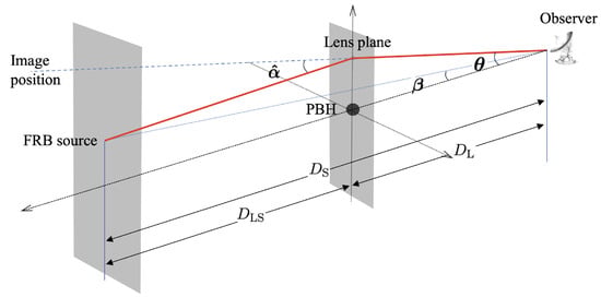 A diagram of GL effect, with a FRB as the source and a PBH as the lensing object. The diagram illustrates the geometric relation of the angular position of the source , the angular position of the image , and the deflection angle . Meanwhile, the diagram shows the angular diameter distances from the source to the lens , from the lens to the observer , and from the source and to observer , respectively.