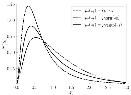 The redshift PDFs of FRBs in the above three models are shown in Figure 3. We observe that the constant and SFH models (the dashed and dotted lines) predict more FRBs at lower and higher redshifts, and the TSRD model (the solid line) is located between them.