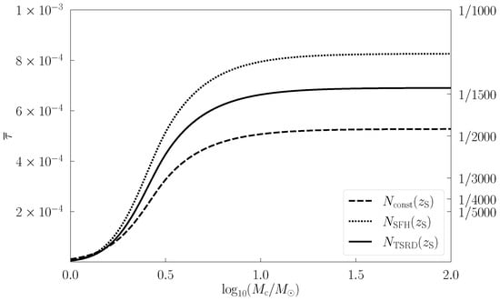 From Figure 4, we find that first increases monotonically as expected, and then approaches a constant when the PBH mass is large enough. It is because once we fix in Equation (8), the minimum of the impact parameter gradually tends to a very low constant as M increases. This further results in the lensing optical depth in Equation (13) and the integral lensing optical depth in Equation (19) being almost constant at large masses. For example, is around in the TSRD model when the PBH mass is larger than , meaning that if 10,000 FRBs are observed in future, no more than 7 lensed events will be detected. Moreover, the constant and the SFH models predict the lowest and highest , with the result from the TSRD model between them, consistent with their redshift PDFs in Figure 3. Hence, the TSRD model not only best fits the experimental data in the Kolmogorov–Smirnov test, but also sets a moderate constraint on the PBH abundance for the monochromatic mass function, so in the following subsections, we will only consider the redshift PDF of FRBs in this model.
