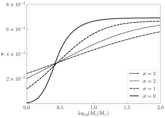 Same as Figure 4, but for the log-normal mass function , with different width of mass distribution , 1, 2, and 3, respectively. When , the solid line is the same as the solid line in Figure 4, as the log-normal mass function reduces to the monochromatic one. With increasing, increases more slowly.