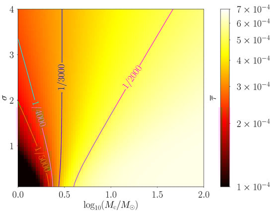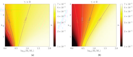 Last, we consider the power-law mass function in Equation (5), with our results plotted in Figure 9a with the power and in Figure 9b with the power . Essentially, is also a two-parameter model, and the effective characteristic mass and the width of the mass distribution can be obtained via Equation (6). Attention, in Figure 9a,b, we can merely determine the sign of , as its specific value varies with and .