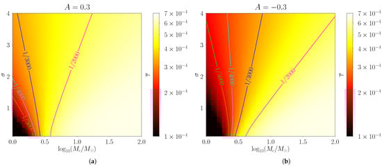 From Figure 8a,b, we find that the influences on from and are similar to those in the log-normal case in Section 5.2 as expected. Moreover, compared with Figure 7, the bright area in Figure 8a is larger, and all the curves clearly rotate to the left, indicating that increases with the skew parameter A. This behavior can also be understood from the solid blue line in Figure 1. We see that, compared with the log-normal mass function with (the black line in Figure 1), when , the skew log-normal mass function significantly shifts rightwards. Therefore, more PBHs are distributed at larger masses, resulting in a larger . In contrast, when , is skewed leftwards, and more PBHs are distributed at smaller masses, which in turn decreases , darkens the colors in Figure 8b, and rotates the curves to the right.