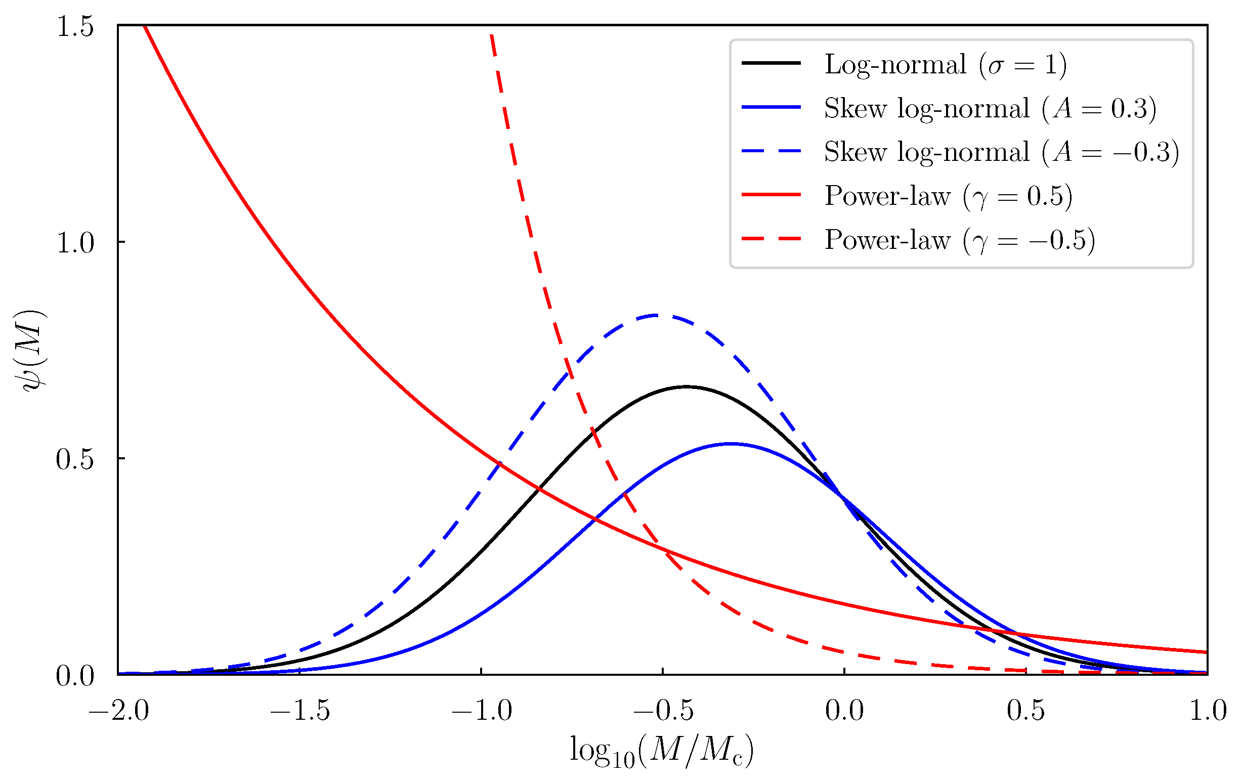 - Skew log-normal mass functionFurthermore, we may consider a more complex skew log-normal mass function , which allows a deviation from the log-normal mass function [119],where is the error function, and a new parameter A indicates the skewness from the log-normal mass distribution.