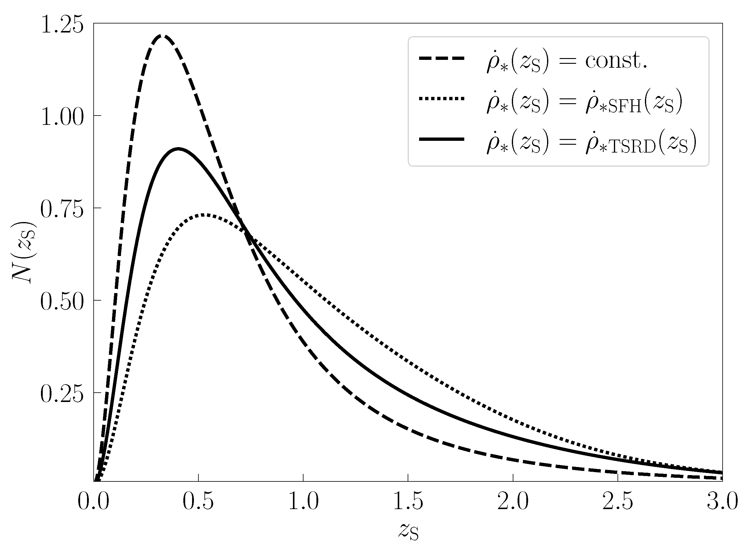 - Besides, Ref. [128] also provided several different redshift distribution models based on the corrected SFH. After the Kolmogorov–Smirnov test, a TSRD model was found to best fit the data, which predicts more (or fewer) FRBs at smaller (or larger) redshifts compared with the SFH model, and is parameterized aswith the model parameters as , , and [128]. Thus, the redshift PDF of FRBs in the TSRD model readswhere is the normalization factor.