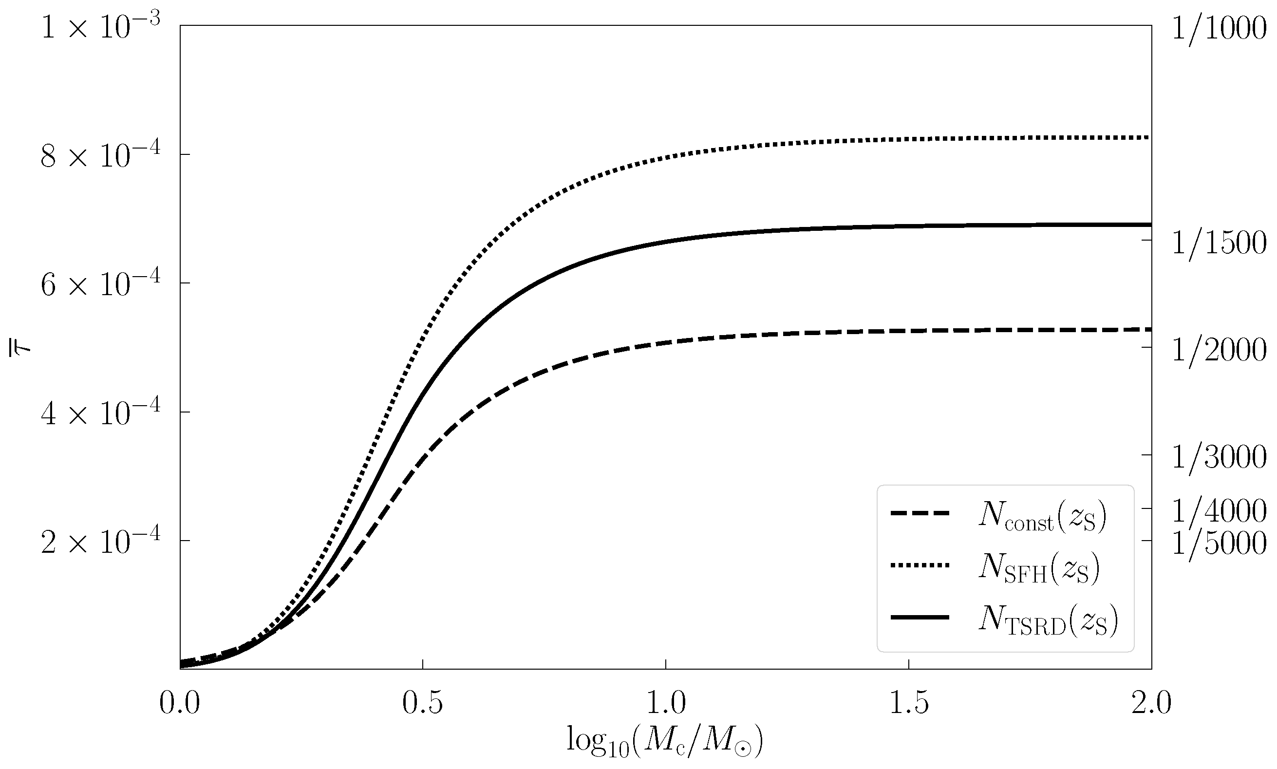 - For the simplest monochromatic mass function , we find that, if is given, increases with and approaches a constant when , as shown in Figure 4. Moreover, the TSRD model predicts a moderate , as its redshift PDF lies between those from the constant and the SFH models, as shown in Figure 3. Equivalently, we also show the dependence of on in Figure 5, with fixed. We observe that decreases with and approaches a constant when .