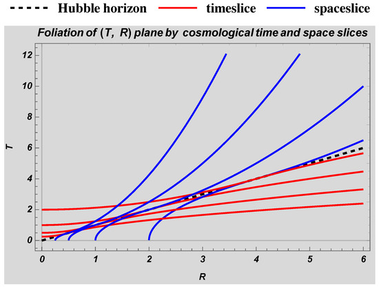 Full spacetime foliation of the plane with respect to cosmological time and space slices, as shown in [21]. The blue slices are the geodesics for a cosmological observer with and the red ones are the spacelike trajectories (). The dashed line is the comoving Hubble radius.