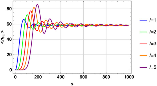 A few comments are needed regarding our final result (81). First and foremost, the particle content is manifestly anisotropic and is now known for any value of the angular momentum quantum number . This is a direct consequence of the fact that the T-vacuum is intrinsically anisotropic, as it is a natural state for observers who envision the radiation-dominated universe as such. Of course, these observers, who are the successors of static de Sitter observers, do not see any particles, as the quantum state is in a vacuum configuration for them. However, the cosmological observers with proper time are bombarded with particles due to their peculiar motion with respect to the frame. These particles are anisotropically distributed in the sky, and their distribution is given by (81). Evidently, this is not a blackbody distribution, and it is not at all a surprise since the relationship between the cosmological and frames does not invoke an exponential redshift relative to each other—rather, it is a power law and quadratic in nature. Furthermore, (81) is time-dependent, and it has an oscillatory behavior with the scale factor, which we depict in Figure 3.