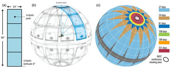 TESS follows a unique observational pattern that divides the sky into sectors of , each of which is continuously observed for approximately 27 days (see Figure 1). The spacecraft uses four wide-field cameras to cover almost 85–90% of the sky over a two-year period.