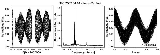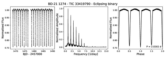A representative one sector long TESS light curve (left-hand panel), Fourier amplitude spectrum (middle panel) and light curve phased with the orbital period (right-hand panel) of an eclipsing binary, TIC 33419790 (BD-21 1274) [12]. Data was downloaded from the MAST Portal (https://mast.stsci.edu/portal/Mashup/Clients/Mast/Portal.html; accessed on 1 June 2025) and was processed by the authors. The light curve in the first panel shows the alternating primary and secondary minima of the eclipses. The spectrum in the middle panel is indicative of a highly non-sinusoidal, monoperiodic signal, with one fundamental frequency and many of it’s harmonics. The photometric data folded with the orbital period in the third panel demonstrates the strictly monoperiodic, repetitive nature of the light variation.