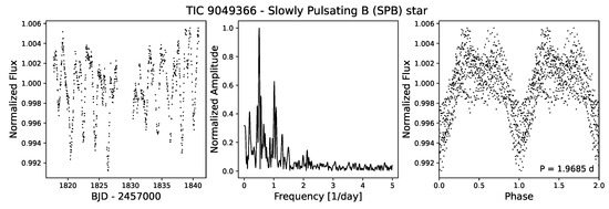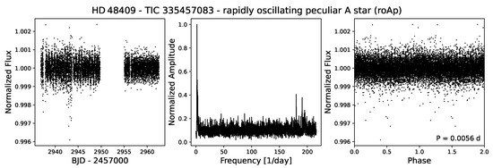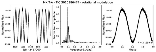 Representative TESS photometric data of a rotationally modulated chemically spotted star, TIC 3010986474 (MX TrA) [34]. The structure and data source of the figure is the same as of Figure 2.